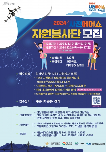 [아시아월드뉴스] 사천에어쇼 추진위원회는 ‘2024 사천에어쇼’의 행사장 질서 유지 및 관람객 안전과 편의 제공 등을 위해 오는 9월 19일까지 자원봉사자 500명을 추가 모집한다고 16일 밝혔다.