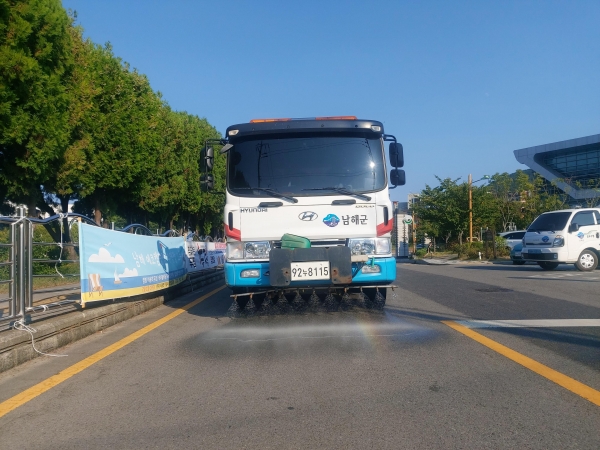 [아시아월드뉴스] 남해군은 최근 폭염이 이어짐에 따라 도로의 열섬 현상을 완화 시키기 위해 지난 2일부터 노면 청소차를 추가로 투입해 도로 살수 작업을 하고 있다고 밝혔다.