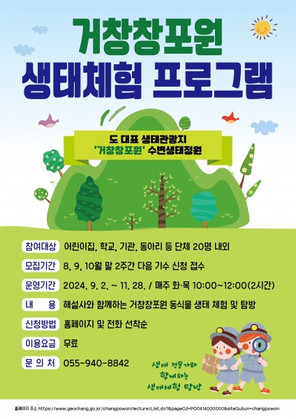 프로그램 신청은 8월 21일부터 거창창포원 홈페이지를 통해 가능하며 자세한 사항은 거창창포원 운영담당로 문의하면 된다.