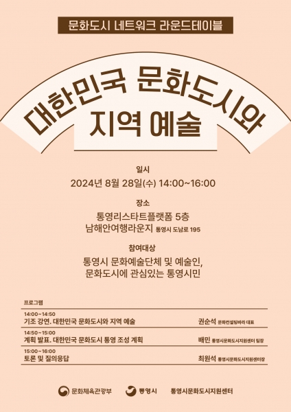 이번 2차 라운드테이블은 통영의 문화예술단체 및 문화예술 관계자, 문화도시에 관심 있는 시민들을 대상으로 진행하며 △ 대한민국 문화도시 기조강연 △ 문화도시 통영 조성계획 발표 △ 토론 및 질의응답 순으로 이루어진다.