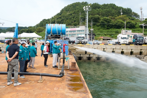 [아시아월드뉴스] 통영시는 경남 해역 적조 예비특보 발표 및 적조 생물 성장에 적당한 해양환경이 지속적으로 유지되고 있어 적조 발생에 선제적으로 대응하고자 지난 19일 관공선 부두에서 적조방제용 황토살포기 시범운영을 실시했다.