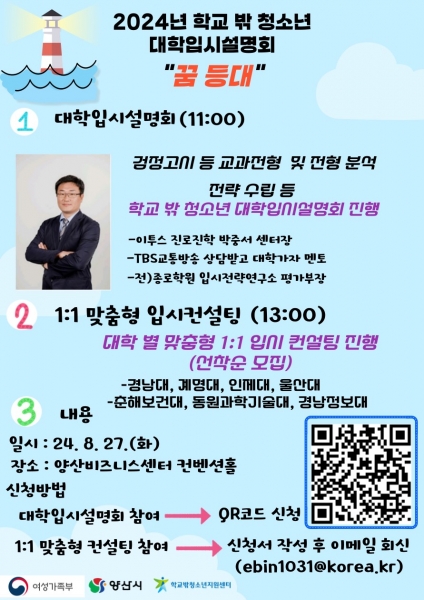 [아시아월드뉴스] 양산시 학교 밖 청소년지원센터는 오는 27일 ‘2024년 학교 밖 청소년 대학입시설명회 꿈 등대’를 운영한다.