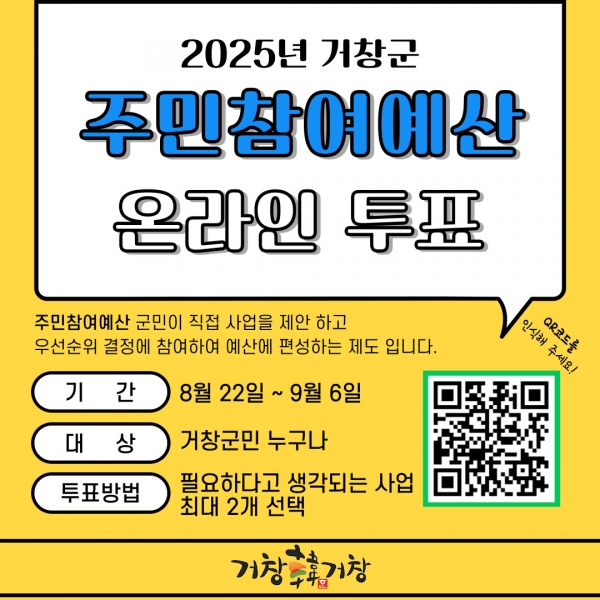[아시아월드뉴스] 거창군은 2025년 주민참여예산 사업 우선순위 결정을 위해 온라인 주민 선호도 투표를 실시한다.