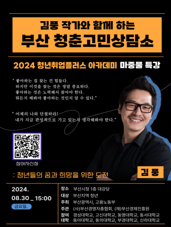 [아시아월드뉴스] 부산시는 오는 8월 30일 오후 3시 시청 대강당에서 부산청년을 대상으로 '청년취업플러스 아카데미'의 시작을 알리는 마중물 특강인 ‘김풍과 함께하는 부산 청춘고민상담소’를 개최한다고 밝혔다.