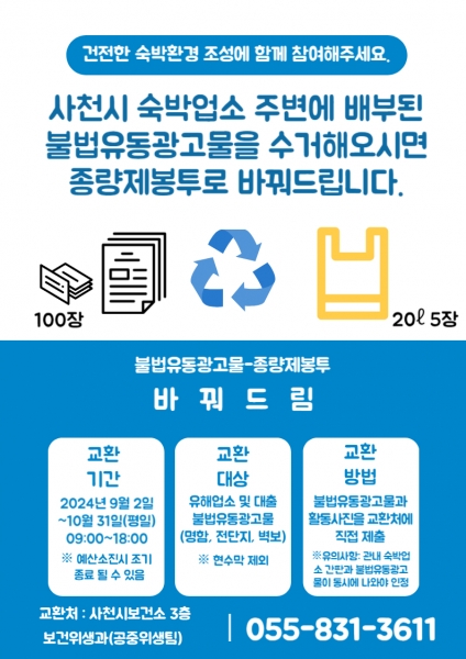 [아시아월드뉴스] 사천시보건소는 건전한 숙박환경 조성을 위해 ‘불법유동광고물-종량제봉투 바꿔드림 사업’을 추진한다고 22일 밝혔다.