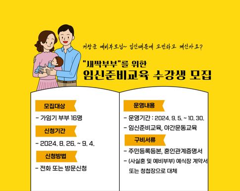 참여를 희망하는 부부는 주민등록등본과 혼인관계증명서를 지참해 보건소 모자보건실로 방문해서 신청하면 된다.