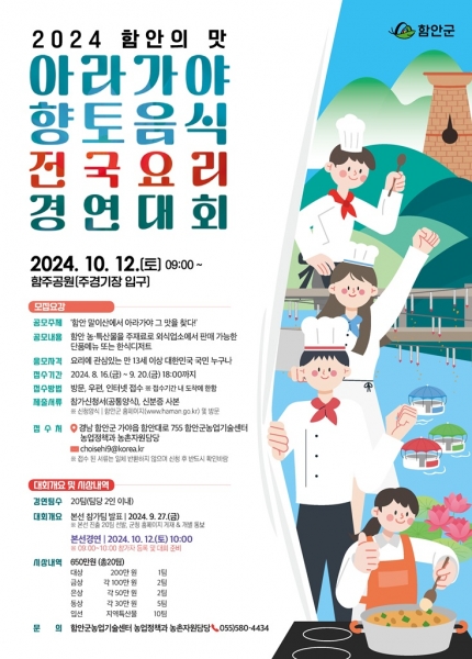 [아시아월드뉴스] 함안군은 오는 10월 12일 함주공원에서 열리는 2024 ‘함안의 맛’ 아라가야 향토음식 전국요리 경연대회 참가자를 이달 16일부터 오는 9월 20일까지 모집한다고 밝혔다.