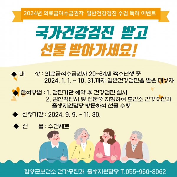 [아시아월드뉴스] 함양군은 올해 의료급여 수급권자 일반건강검진 조기 수검 독려를 위해 10월까지 수검 완료자에게 선물 증정 이벤트를 실시한다.