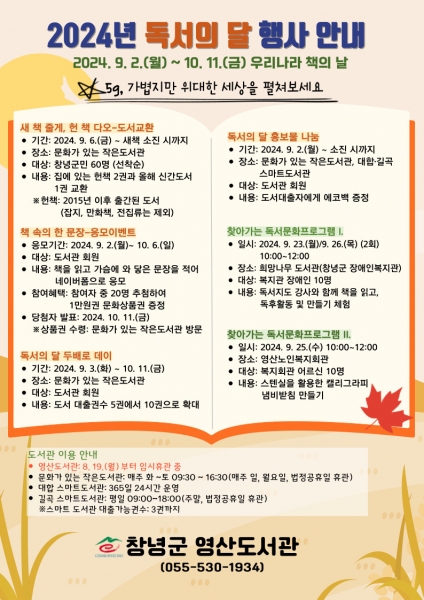 또한, 영산도서관이 리모델링 공사로 휴관 중임에 따라, ‘찾아가는 독서문화프로그램’과 문화가 있는 작은도서관에서 행사를 운영한다.