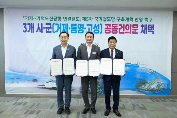 박종우 거제시장, 천영기 통영시장, 이상근 고성군수는 지난 27일 거제시청에서 거제~가덕도신공항 연결철도를 제5차 국가철도망 구축계획에 반영해달라는 내용의 공동건의문에 함께 서명했다.