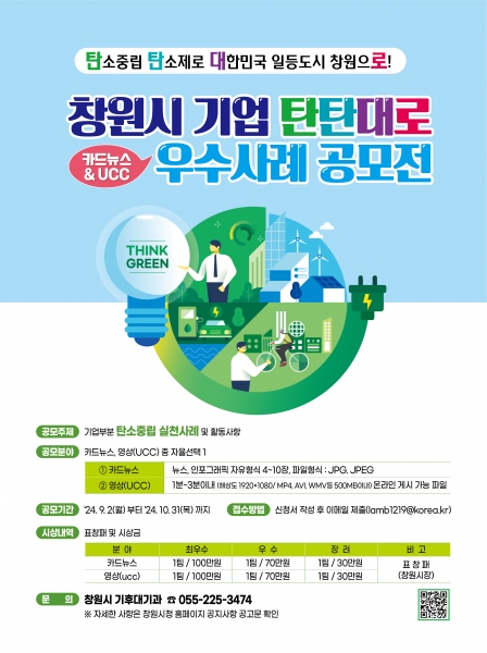 [아시아월드뉴스] 창원특례시는 오는 9월 2일부터 10월 31일까지 ‘탄소중립 탄소제로 대한민국 일등도시 창원으로’라는 주제로 ‘2024년 창원시 기업 탄탄대로 우수사례 공모전’을 개최한다고 28일 밝혔다.