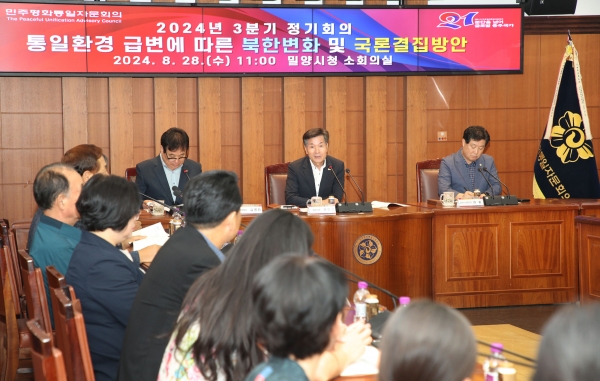 [아시아월드뉴스] 민주평화통일자문회의 밀양시협의회는 28일 시청 소회의실에서 안병구 밀양시장, 자문위원 등 40여명이 참석한 가운데‘통일환경 급변에 따른 북한 변화 및 국론결집 방안’을 주제로‘2024년 3분기 정기회의’를 개최했다.