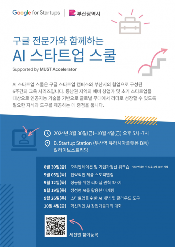 올해는 '부산시와 함께하는 인공지능 스타트업 스쿨'이라는 프로그램으로 오늘부터 10월 4일까지 매주 1회, 총 6회 과정으로 부산유라시아플랫폼에서 운영된다.