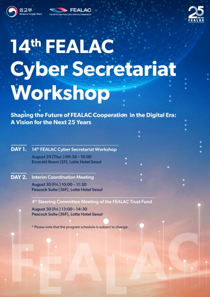 [아시아월드뉴스] 외교부가 주최한 ‘제14차 동아시아-라틴아메리카 협력포럼 사이버사무국 워크숍’ 이 ‘디지털 대전환 시대 FEALAC의 미래 협력 방안 모색 - 향후 25년을 위한 비전’을 주제로 8.29. 서울에서 개최됐다.