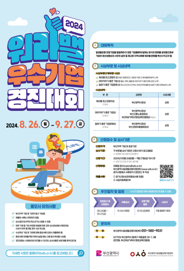 [아시아월드뉴스] 부산시는 일·생활 균형 직장환경 조성과 문화 확산을 위해 오는 9월 27일까지 ‘2024 워라밸 우수기업 경진대회’ 참가기업을 모집한다고 밝혔다.