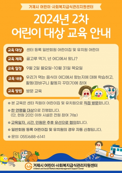 [아시아월드뉴스] 거제시 어린이·사회복지급식관리지원센터는 9월 2일부터 10월 31일까지 지역 내 어린이급식소 155개소 어린이를 대상으로 영양교육을 실시한다.