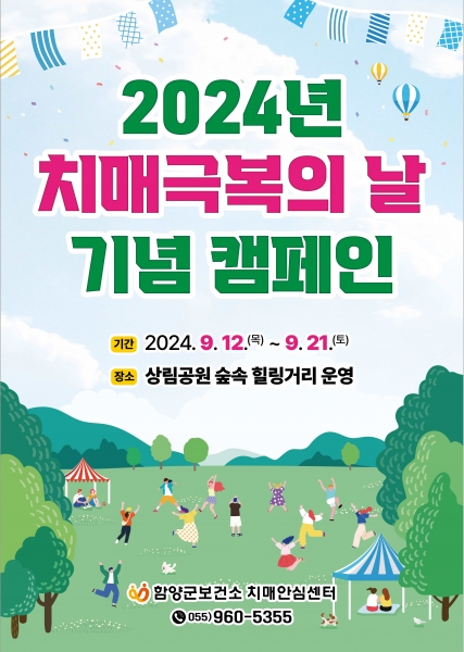 함양군보건소도 치매극복의 날을 맞아 9월 12일부터 21일까지 상림 숲속에 치매친화문구가 적힌 가랜드를 설치하는 등 힐링거리 캠페인을 진행해 치매극복의 날을 소개하고 치매안심센터 사업 안내와 치매조기검진, 치매 인식개선의 중요성 등을 알릴 계획이다.