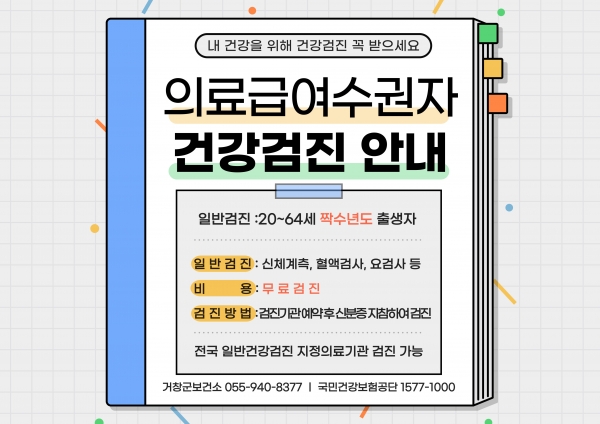 [아시아월드뉴스] 거창군은 의료급여수급권자가 건강한 생활을 할 수 있도록 돕고자 건강검진비를 연중 지원하고 있다.