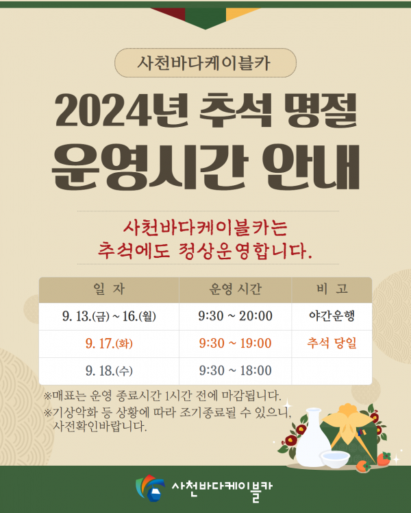 한편 케이블카는 추석 명절을 맞아 13일부터 18일까지 ‘3만원 상품권’ 증정 SNS 이벤트를 비롯해 17일 추석 당일에 한해 ‘사천시 농·특산 기념품’ 증정 이벤트를 실시한다.