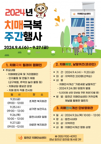 이번 치매극복 주간행사는 "사랑과 관심으로 펼쳐요, 치매극복"이라는 슬로건 아래 진행되며 9월 4일부터 합천군치매안심센터 카카오톡 채널을 통해 치매 예방 온라인 퀴즈 이벤트가 운영된다.