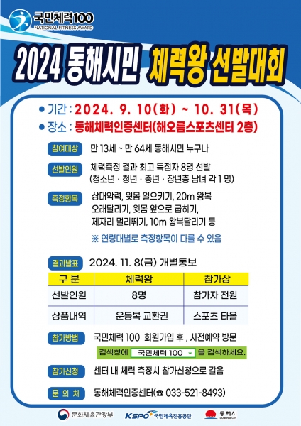 ‘동해시민 체력왕 선발대회’는 만 13세 이상 64세 미만 동해시민이면 누구나 무료로 참가할 수 있고 상대 악력, 왕복달리기, 윗몸일으키기, 윗몸 앞으로 굽히기 등 최대 6 ~7개 항목에 걸쳐 체력측정 평가를 받는다.