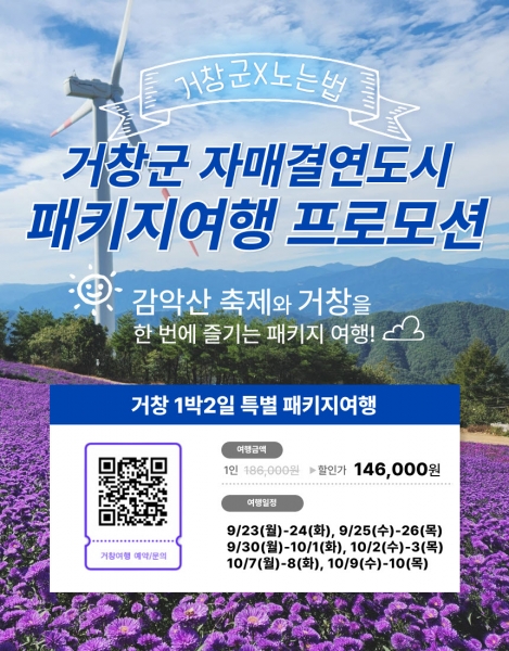 이번 프로모션은 자매결연 도시 주민을 대상으로 1인당 정상가 186,000원에서 40,000원 할인된 146,000원에 1박 2일간의 거창 여행을 즐길 수 있는 특별한 기회를 제공한다.