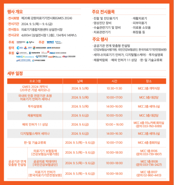 의료기기의 경쟁력을 확보하고 수출을 견인하기 위해 지난 2006년부터 개최하고 있는 GMES는 올해로 20회를 맞아 기존 의료기기 중심에서 바이오, 천연물 등 도내 육성 산업과 연계, 바이오헬스 영역으로 확장해 전시 산업군을 확대운영하고 성과 확산을 위한 프로그램을 기획해 도민에게 산업성과를 효과적으로 전달하는 축제로 자리매김하고자 대대적인 개편을 단행했다.