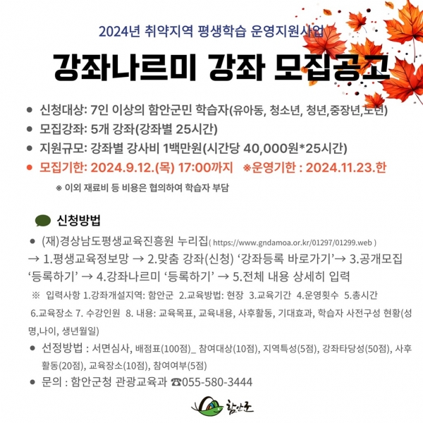 [아시아월드뉴스] 함안군은 군민의 평생학습 참여 기회를 확대하고 언제, 어디서나 평생학습을 즐길 수 있도록 오는 12일까지 ‘강좌나르미’ 참여자를 모집한다고 밝혔다.