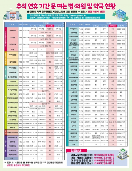 추석 연휴기간 진료가 가능한 병·의원과 약국에 관한 자세한 정보는 거제시 누리집과 거제시에서 운영하는 SNS에서 확인할 수 있으며 보건복지콜센터, 구급상황관리센터 및 스마트폰 앱에서도 안내받을 수 있다.