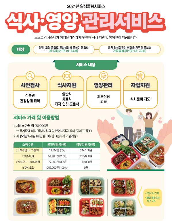 이 중 식사·영양관리 서비스는 스스로 식사 준비가 어려운 질병·부상자, 암 환자 등에게 주 2회의 맞춤형 식사·영양관리를 제공한다.