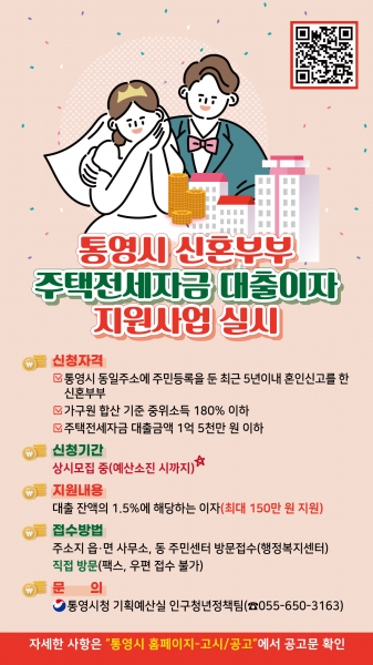 [아시아월드뉴스] 통영시는 관내 신혼부부의 주거비 부담을 완화하고 결혼·출산 친화환경을 조성하기 위해 ‘신혼부부 주택 전세자금 대출이자 지원 사업’의 대상자를 상시 모집 중이다.