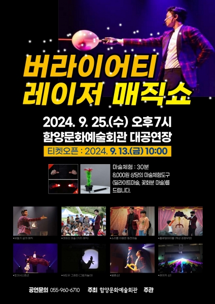 [아시아월드뉴스] 함양군 문화시설사업소는 문화가 있는 날 9월 행사로 오는 25일 오후 7시 함양군문화예술회관 대공연장에서 ‘버라이어티 레이져 매직쇼’ 공연을 개최한다고 밝혔다.