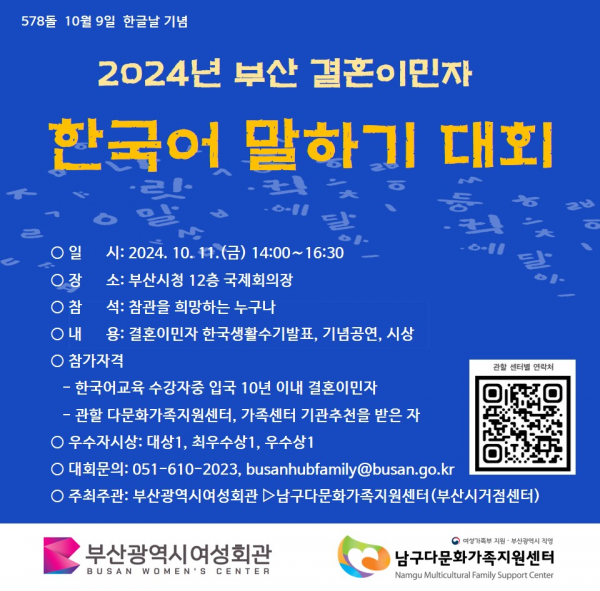 [아시아월드뉴스] 부산시 여성회관은 578돌 한글날을 맞아 오는 10월 11일 오후 2시 시청 국제회의장에서 ‘2024년 부산 결혼이민자 한국어말하기 대회’를 개최한다고 밝혔다.