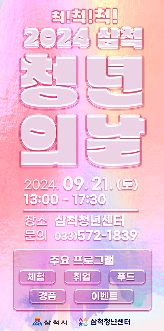 이번 행사는 “척 척 척”라는 이름으로 개최할 예정으로 관내 만 18세 ~ 39세의 청년들을 대상으로 삼척청년센터에서 진행될 예정이다.