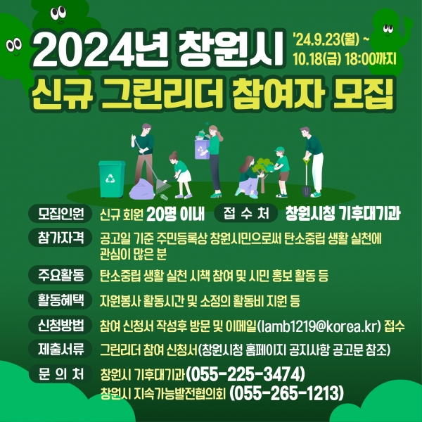 [아시아월드뉴스] 창원특례시는 오는 10월 18일까지 기후위기 대응을 위해 탄소중립 실천 문화 확산 및 녹색생활 실천 운동을 선도할 신규 그린리더를 모집한다고 24일 밝혔다.