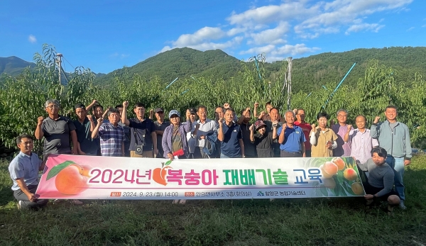 복숭아 농가 30여명이 참여한 이번 교육은 고품질 복숭아 생산을 위해 충북 음성군 복숭아 선도 농가인 송찬의 농가를 초청해 복숭아 재배기술 노하우와 수확 후 과원 관리, 과원 조성 시 준비사항 등을 주제로 이론과 현장 교육을 병행해 추진했다.