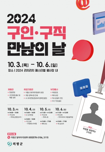 [아시아월드뉴스] 의령군은 10월 3일부터 6일까지 나흘간 진행되는 제3회 리치리치 페스티벌 기간에 ‘구인·구직 만남의 날’ 행사를 개최한다고 24일 밝혔다.