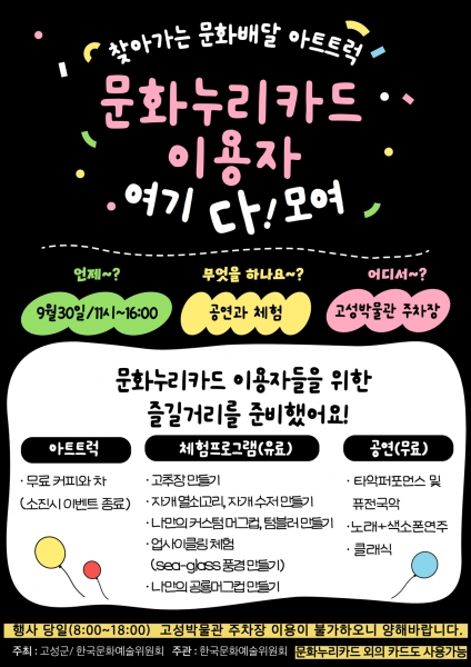 고성군 관계자는 “아트트럭 행사를 통해 지역주민들이 다양한 예술적 경험을 쌓고 문화누리카드를 적극적으로 활용할 수 있기를 기대한다”고 말했다.