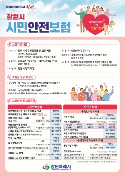 [아시아월드뉴스] 창원특례시는 예기치 못한 재난 및 안전사고로부터 피해를 입은 시민의 생활 안정을 위해 2024년 창원시 시민안전보험을 22일부터 1년간 재가입했다고 밝혔다.