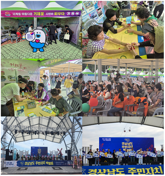 거제시 주민자치회 연합회장은 ‘사계절 아름다운 거제꽃 시민이 키우다’라는 주제로 부스를 운영하면서 주민자치회원들이 자율적으로 소공원을 지역의 명품 꽃정원으로 만든 사례와 봄, 여름, 가을, 겨울 지역 특성에 맞는 축제행사를 알리는 내용의 대형 현수막을 제작해 거제시를 경남도 내 널리 알렸다.