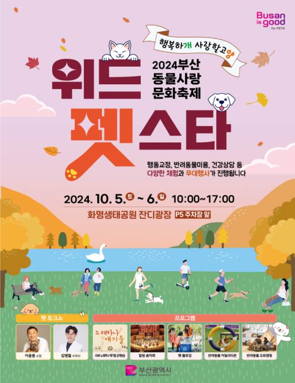 [아시아월드뉴스] 부산시는 10월 5일부터 6일까지 이틀간 화명생태공원 잔디광장에서 부산 동물사랑 문화축제 ‘2024 위드펫스타’를 개최한다고 밝혔다.