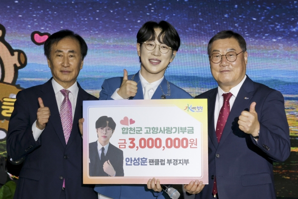 먼저, 합천군 쌍책면 출신 가수 안성훈씨의 팬클럽 후니애니 부경지부에서 27일 대야문화제 점등식에서 300만원을 기탁했다.