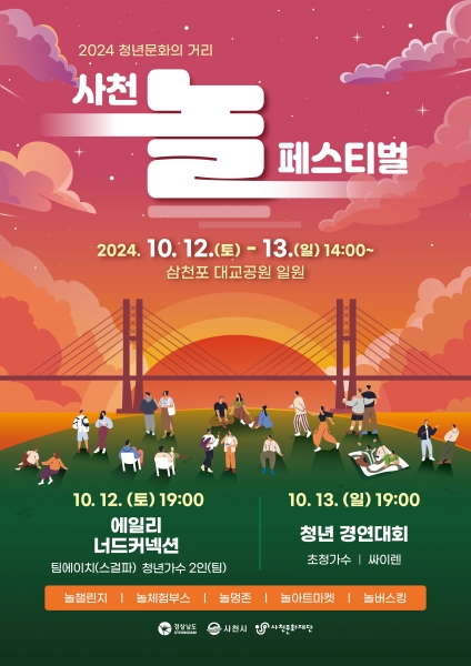함께 즐기며 사천의 아름다운 노을과 청년문화의 매력을 마음껏 느껴보세요” 사천시와 사천문화재단이 함께하는 ‘2024 청년문화의 거리’ 사천 놀 페스티벌이 오는 10월 12일부터 13일까지 이틀간 삼천포대교공원 일원에서 펼쳐진다.
