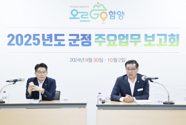 [아시아월드뉴스] 함양군이 9월 30일과 10월 2일 양일간 군청 소회의실에서 ‘2025년도 군정 주요업무 보고회’를 개최한다.