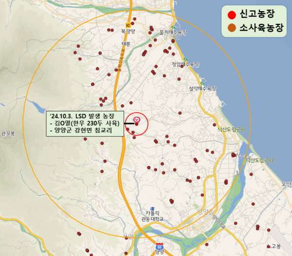 사육 중인 소에서 의심증상을 발견한 농장주가 10월 3일 오전 양양군에 신고했고 동물위생시험소 가축방역관이 혈액 등 시료를 채취해 검역본부에서 정밀검사를 실시한 결과, 해당 농장 내에서 럼피스킨병이 최종 확진됐다.