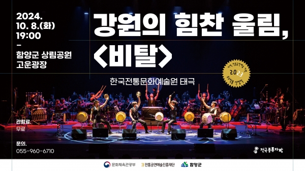 [아시아월드뉴스] 함양문화예술회관은 10월 8일 19:00 상림공원 고운광장 산삼축제 주무대에서 대중성과 작품성을 인정받은 강원의 힘찬울림 ‘비탈’ 작품을 선보일 예정이다.