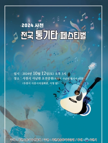 [아시아월드뉴스] 통기타 동호인들이 가을 낭만을 노래하는 ‘2024 전국 통기타 페스티벌’ 이 오는 12일 오후 3시 사천시 사남면 초전공원 무대에서 열린다.