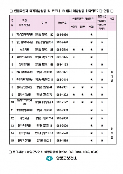 관내 인플루엔자 위탁의료기관은 강남가정의학과의원, 동신가정의학과의원, 성모의원, 속편한내과의원, 정해일의원, 제일가정의학과의원, 중앙의원, 한마음연합의원, 함양성심병원, 함양웰소아청소년과의원, 함양튼튼정형외과의원, 홍인의원, 안의중앙의원, 한사랑의원, 현대가정의원이다.
