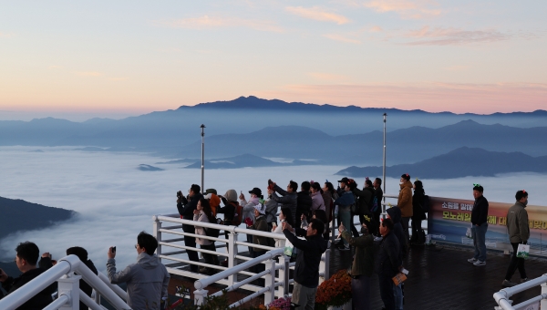높은 가을 하늘을 단풍처럼 붉게 물들인 대봉산 일출과 산 능선마다 걸쳐져 있는 운해가 장관을 이루어 보는 이들로 해금 탄성을 자아내게 했다.