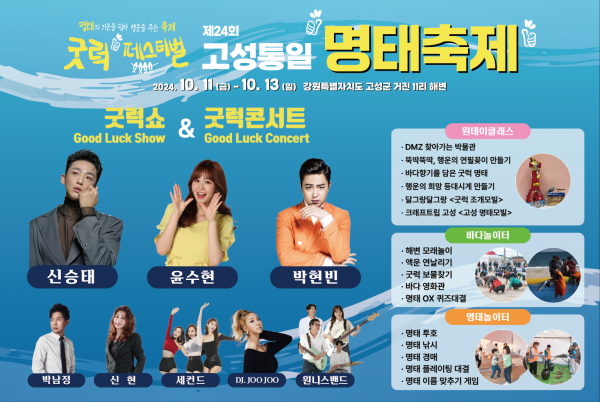 이에 ‘국민 생선 명태’, ‘기후변화’, ‘복 맞이’ 핵심 키워드를 선정하고 다양한 명태요리 부스와 명태 가공식품 판매 부스를 준비하는 한편 기후 위기에 대응하는 바다를 살리는 업-사이클링 공예 체험과 액운을 날리는 연날리기 체험, 행운을 찾는 보물찾기, 액막이 포토존, 물멍 비치, 명태 비치바 등 고성통일명태축제만의 장소성과 문화를 반영한 프로그램을 신설하고 기존의 프로그램들은 더욱 보강해 남녀노소 알차게 즐길 수 있는 축제가 될 예정이다.